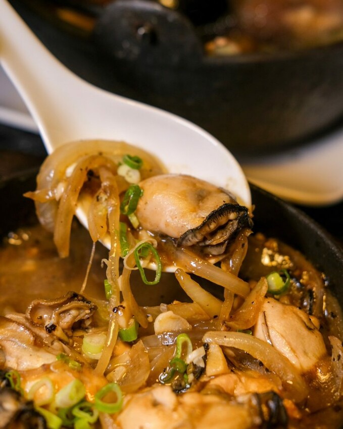 ▼以鑄鐵鍋裝盛的蚵仔奶油燒,掀蓋後奶油香氣撲鼻而來,飽滿的蚵仔咬下會爆汁,搭配洋蔥和香菇吃起來更有層次。