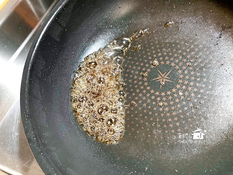 把油鍋裡的油倒乾淨,先放水再放糖,開小火加熱煮到糖溶解