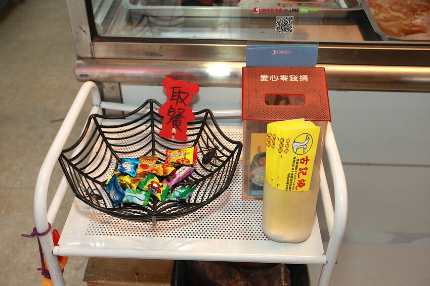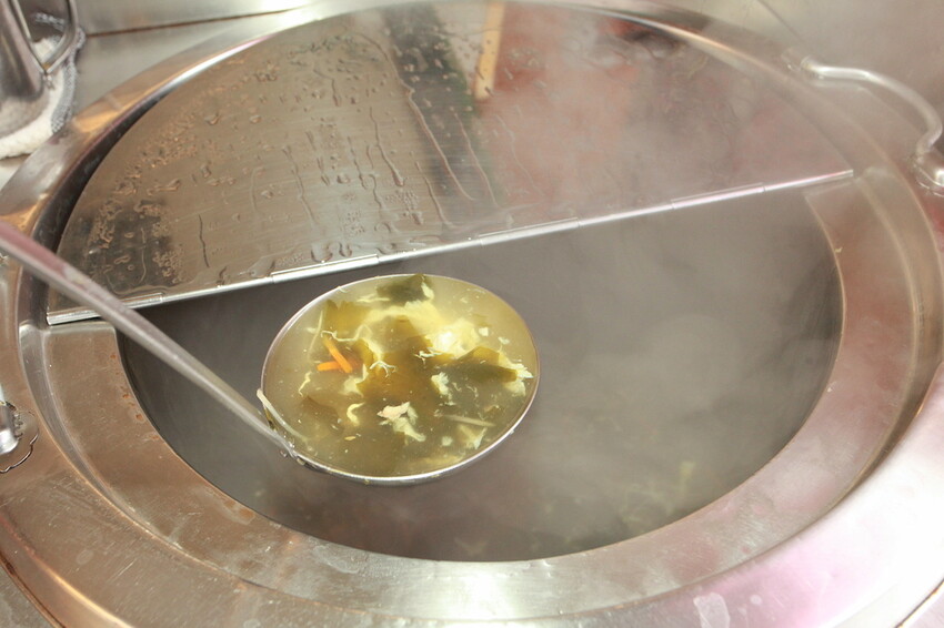騎樓有放置紫菜蛋花湯供自取食用。