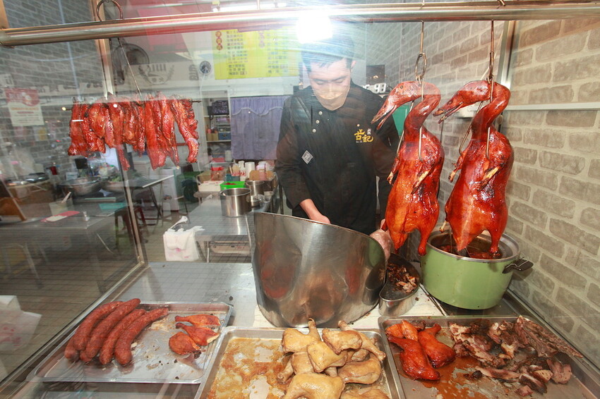老闆很親切讓我隨性拍照與各位分享,穿著廚師的制服看起來很專業,手腳很俐落剁著各種燒臘食材。