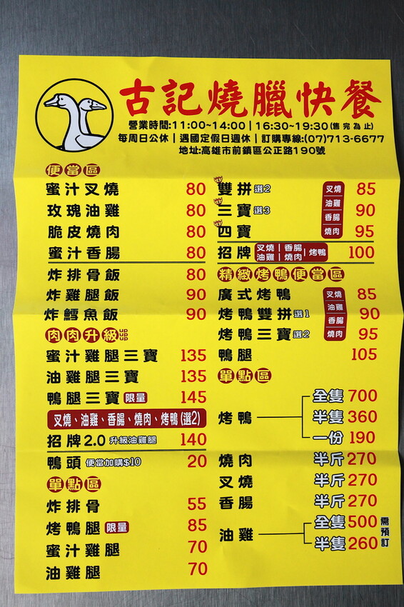 前鎮瑞隆路周遭是很多美食聚集的地方,附近道路也隱藏許多傳統美食,小高今天來到這附近出差洽談公事,回程發現這家「古記燒臘快餐」生意很好,就決定買燒臘便當回家當晚餐享用,這家「古記燒臘快餐」開業至今有3年歷史,老闆說他曾經在林皇宮當過廚師,離開飯店來到前鎮公正路上創業,創業至今也獲得當地居民的喜愛,因此用餐時段總是出現排隊人潮,品嚐完覺得美味定價親民,值得樂天小高極力推薦給您品嚐。