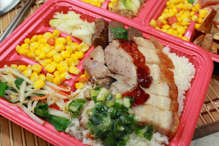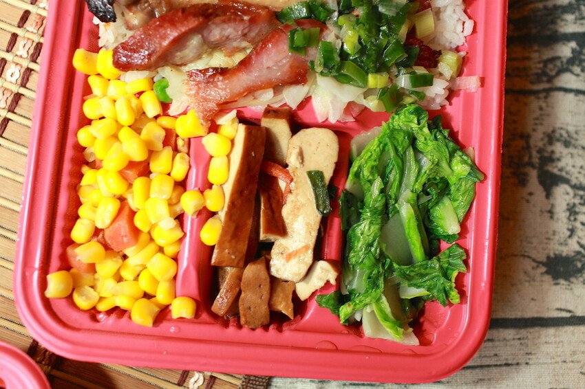 烤鴨雙拼小高選我女兒喜歡的火肉來搭配,便當盒裡面有烤鴨、火肉、四樣配菜等,服務員會問想要不要加油蔥醬汁,小高我當然全部都要加油蔥來提味,這便當份量很多食量大者吃的飽。