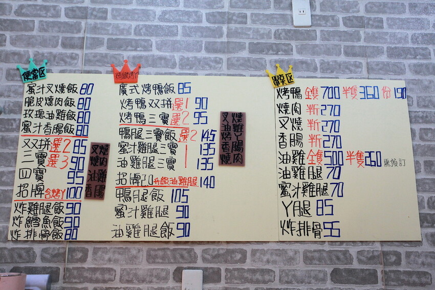小高點烤鴨雙拼90元、烤鴨三寶95元及蜜汁叉燒飯80元。