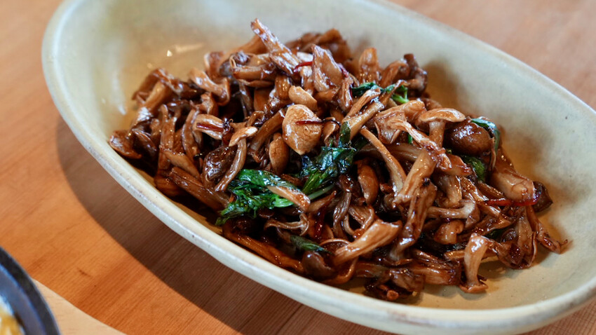 這道生爆野鮮菇便是使用產銷履歷驗證的杏鮑菇,乾煸料理方式呈現,加入九層塔提香,入口時是鮮菇的清香與醬燒的醇郁,好對味。