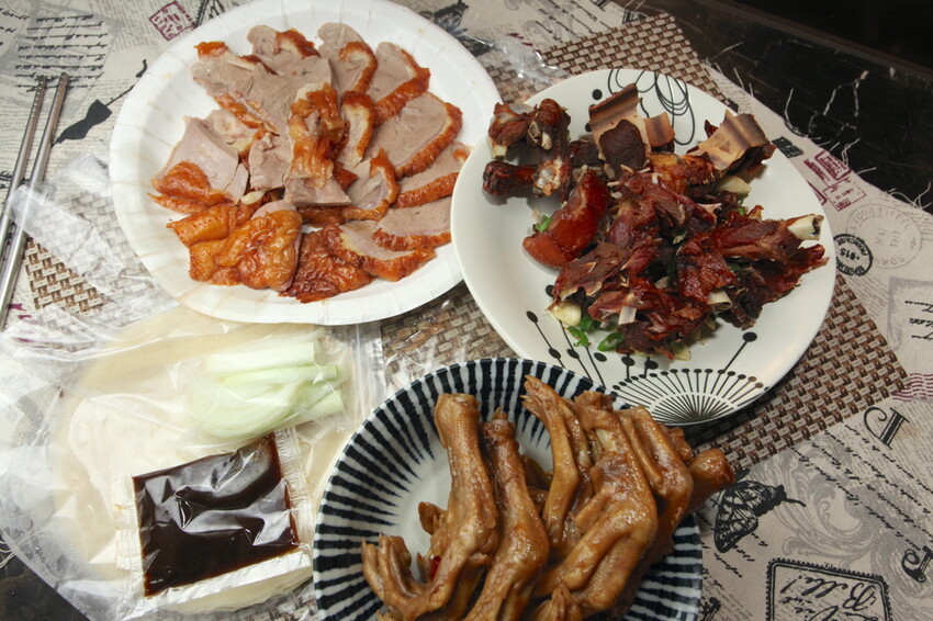 小高點半隻一鴨二吃300元,兩吃小高是選擇片肉和鹹酥鴨,半隻有附餅皮一包、醬料給一包、蔥段及洋蔥等,小高還加購一包滷鴨腳50元。