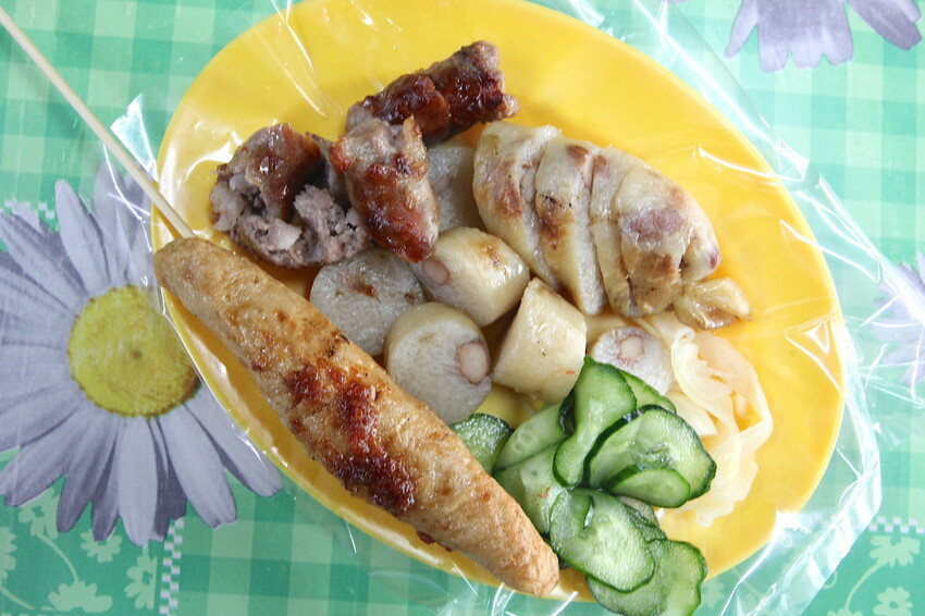 這盤有大腸+香腸60元和烤甜不辣15元。