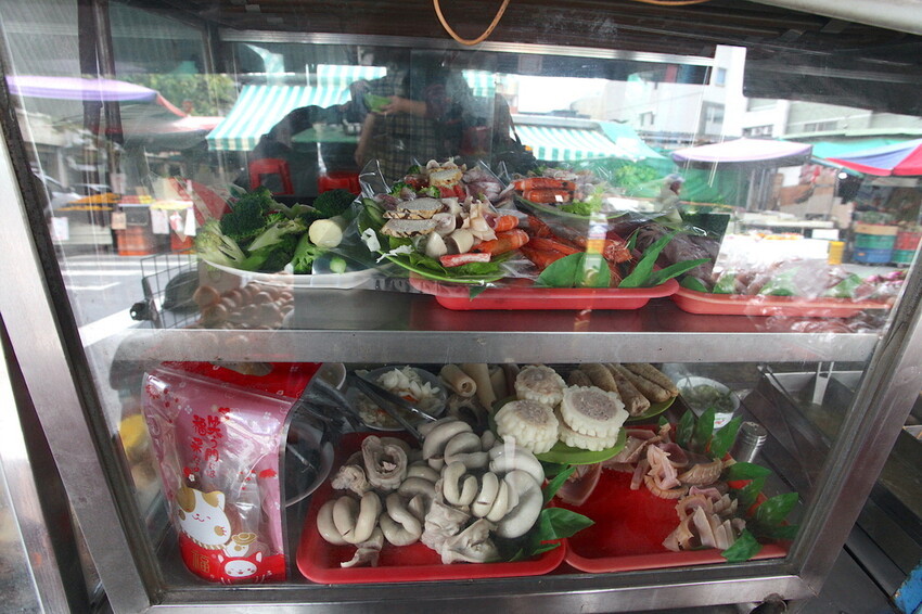 小高今天點大腸+香腸60元、新竹大貢丸16元、烤甜不辣15元及苦瓜封50元等,想要喝熱湯就自己拿碗裝來喝。