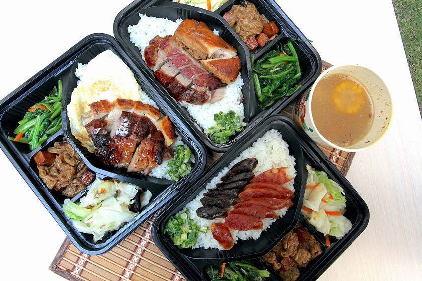 把便當蓋子拿下來拍張全體照,餐點有尖沙咀招牌飯130元 、三寶飯120元、特製雙拼飯 110元、加價10元港式煲湯及加價15元荷包蛋等。