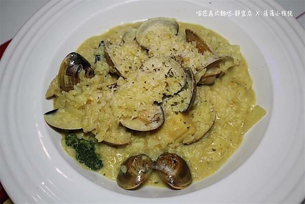 帶點薑黃色、口感偏濕潤的咖哩蛤蜊飯,每一顆飯粒都完整的包覆在咖哩醬裡,裡頭放了超多的蛤蜊,一口吃下,飯裡有蛤蜊的鮮甜,濃郁的醬香,微鹹的起司粉,這樣一份超霸氣的咖哩蛤蜊燉飯,每一口都讓人好滿足!