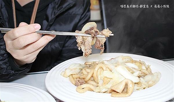 夾起一口剛送上桌,還在冒著熱氣的日式壽喜牛肉炒烏龍麵。