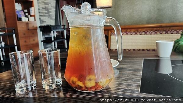 用餐到一半,服務人員端上水蜜桃冰沙,喝起來酸酸甜甜很爽口,剛好也可以解火鍋的膩
