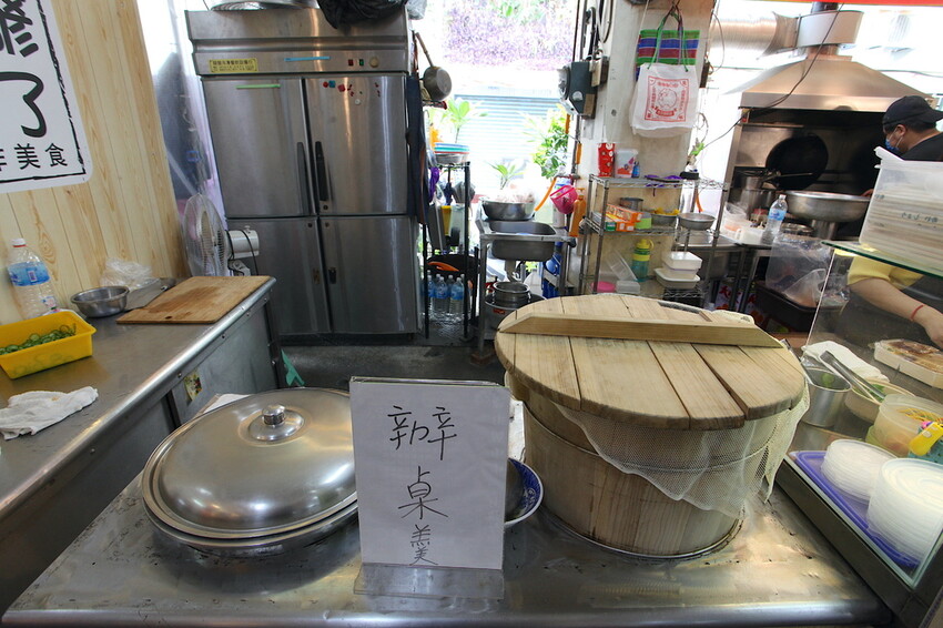 這檯面上放置油飯和辦桌羹供顧客選購。