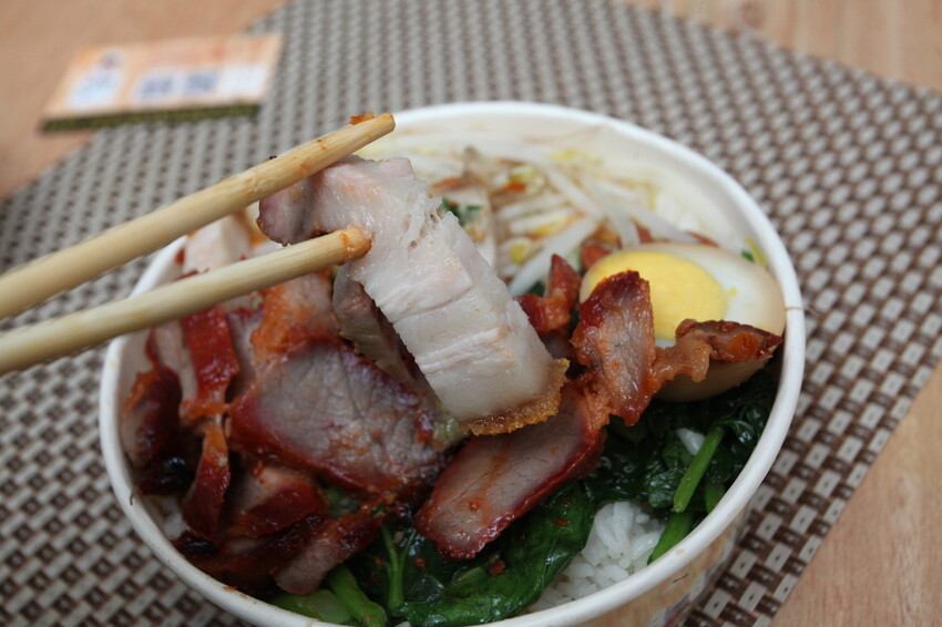 這雙拼有叉燒跟火肉兩樣主菜淋上油蔥醬。
