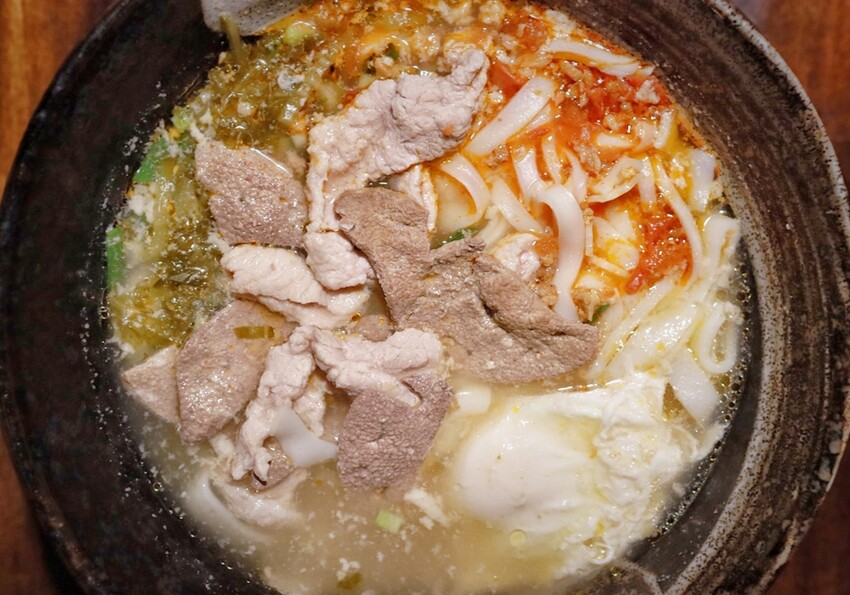 服務人員一開始會將高湯倒進石鍋裡,而我們再依序放入雞蛋、豬肉片、綜合蔬菜、米干就可以。而Ann很喜歡石鍋的湯頭勝過於招牌八妹全加的湯頭,石鍋湯頭帶點淡淡的胡椒香氣且溫醇又順口,搭配著多種配料一起吃吃,真的很不錯!