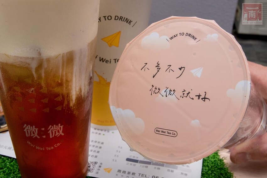 黃色招牌佇立在路邊就是特別顯眼,店名叫『微微茶飲』是希望大家能夠『生活有點酸、有點甜,人生不求太多太少,微微就好』,而看到紙杯上的紙飛機,也讓小編想到小時候的單純,不會要求太多、很容易滿足。