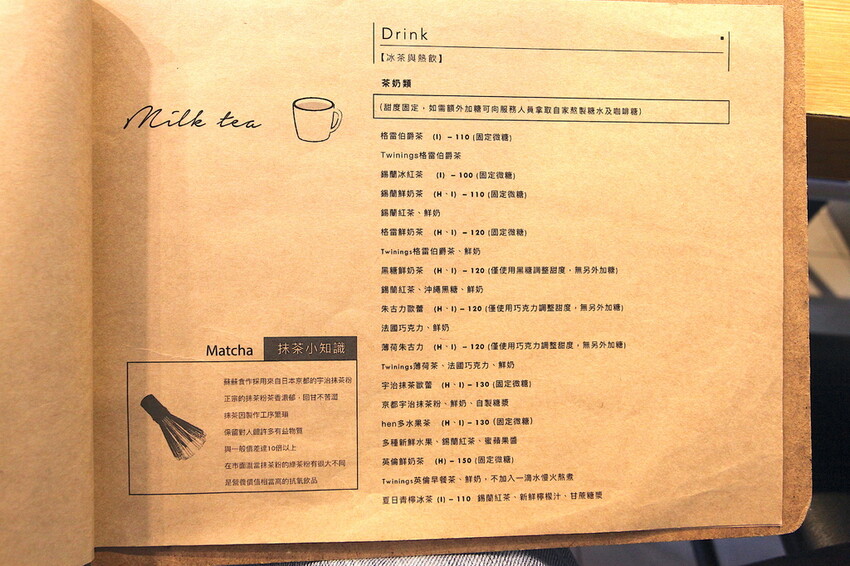 這厚厚一本菜單供顧客點餐參考,餐點品項超多可供選擇,餐點有主要分類有早午餐料理、義大利麵料理、三明治與小點心及各種飲品等,整體餐點定價在250~350元區間,需要額外收取10%服務類喔!