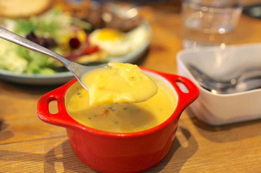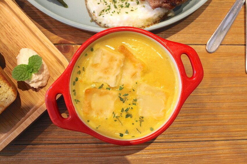 今天點蔣夫人鑄烤牛排350元、青檸奶醬鮭魚麵250元、每日手作濃湯65元及磅蛋糕85元等。