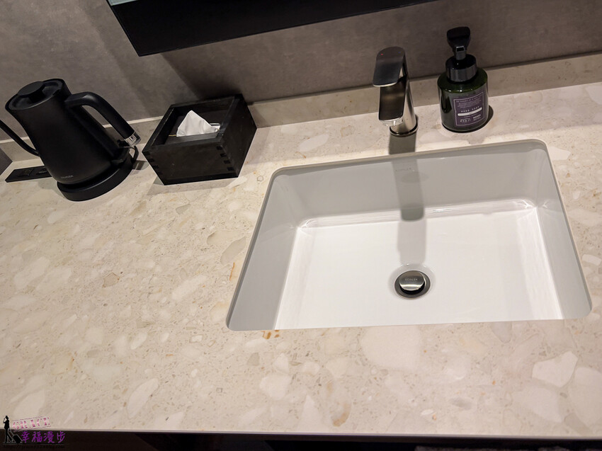 踏進房間的左側是mini吧和洗手檯,我很喜歡這樣的設施,在日本的商務飯店要找到這種寬敞的檯面幾乎很少,而且女生出國總少不了瓶瓶罐罐的保養品,有些商務飯店的洗手檯面真的沒地方放,這裡要擺放物品真的太便利了。