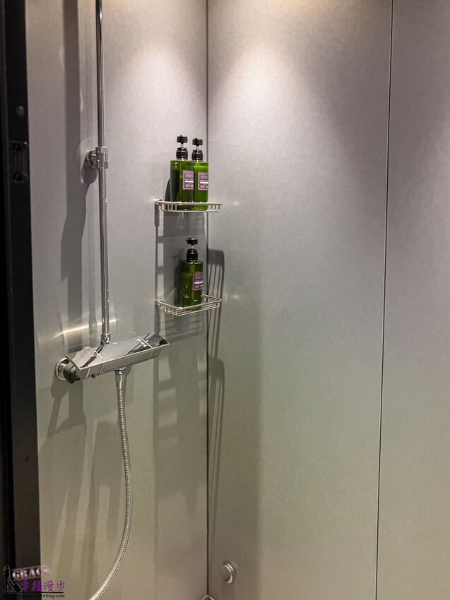 淋浴空間,水量非常充足,這個房型是沒有浴缸的,網站上有看到其他房型是有浴缸的喔!有浴缸房型價格會略高些。