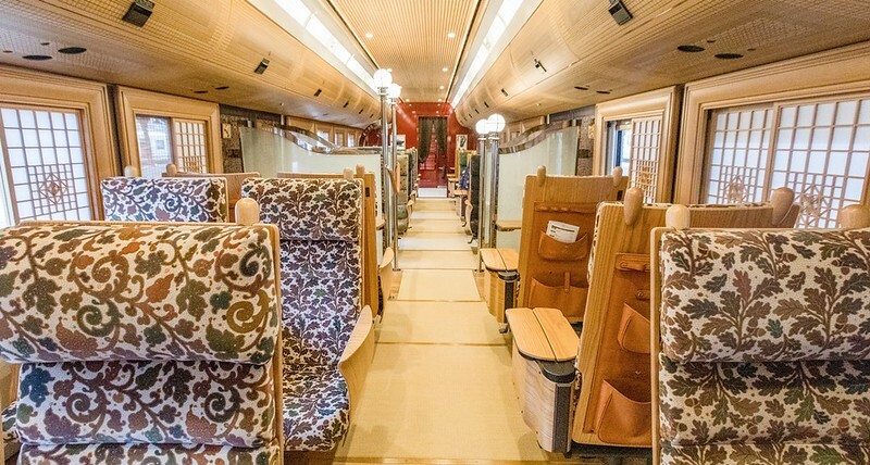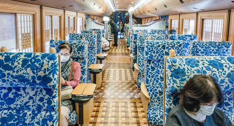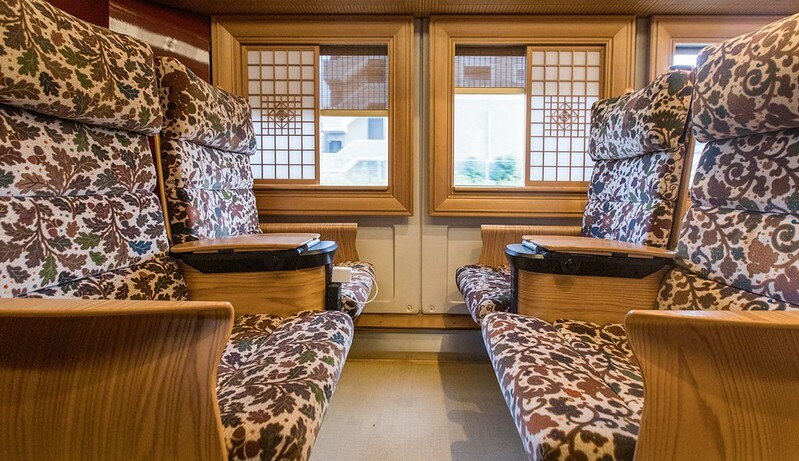 先來看5號車廂,格木的地板配上藍花紋座位,車廂內外隨處可見淡淡日式風情的作畫及藝術品,座位跟一般的日本電車相比寬敞了許多,沙發式的座椅也相當舒適,桌上還有簡約的流線造型,有一點點飛翔的視覺。