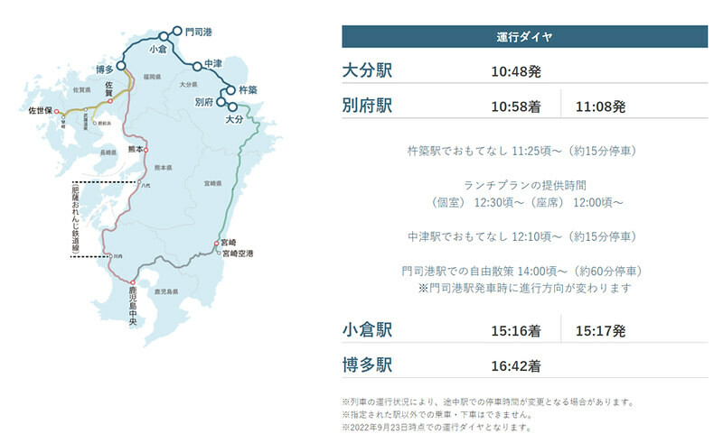 36+3號列車(官網):週日(青の路)路線特色大分-別府-杵築(停靠站)-中津(停靠站)-門司港(停靠站/60分鐘散步觀光)-小倉-博多。預約36+3列車座位