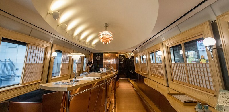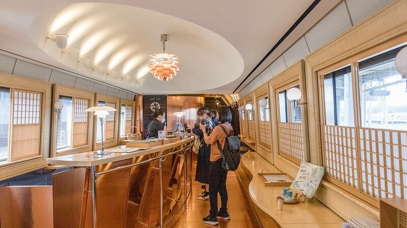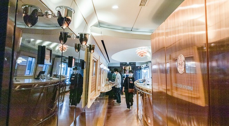 有一點華麗的木造車廂,前端還有一個購物、小櫃檯,另一側是大電視螢幕,兩旁面窗的木桌、木椅,供乘客一邊用餐、一邊喝酒,一邊欣賞九州明媚的風光。