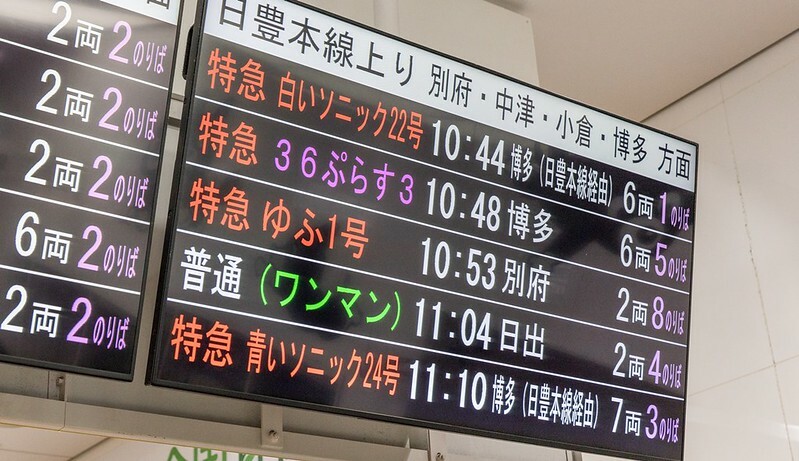 我們當天搭的是10:48分,每星期日由大分開往博多的「青之日」36ぷらす3(粉紅色),中間以門司港為界,分為8110M 大分→門司港(停杵築、大分)8107M 門司港→博多兩段,我們是全程搭乘,所以門司港會停留60分鐘。