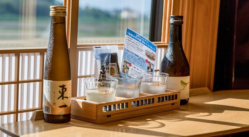 車上的清酒都是九州的地酒,有180ml小瓶的,也有三瓶一個set的組合,每一小杯都搭配九州當地小菜,比方小魚乾、海苔等、起司等。對我來說,觀光列車上沒有地酒就像少了一味般。