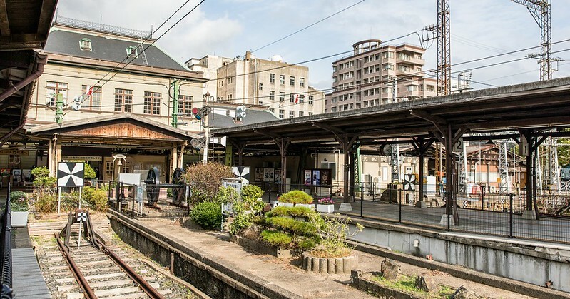 門司港站(14:00到 / 停留約60分鐘),月台上有列車的製服、帽子供遊客拍照。