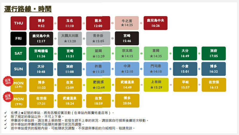 這五條「36+3」的行駛路線,起、始地點、時間,及停靠的站數、迎賓活動、車上活動都不太一樣,我們這次搭乘的(青の路)路線特色大分-別府-杵築(停靠站)-中津(停靠站)-門司港(停靠站)-小倉-博多,當中最特別的是會在門司港這站停留60分鐘,遊客並可以走出車站,來場門司港懷舊小旅行。