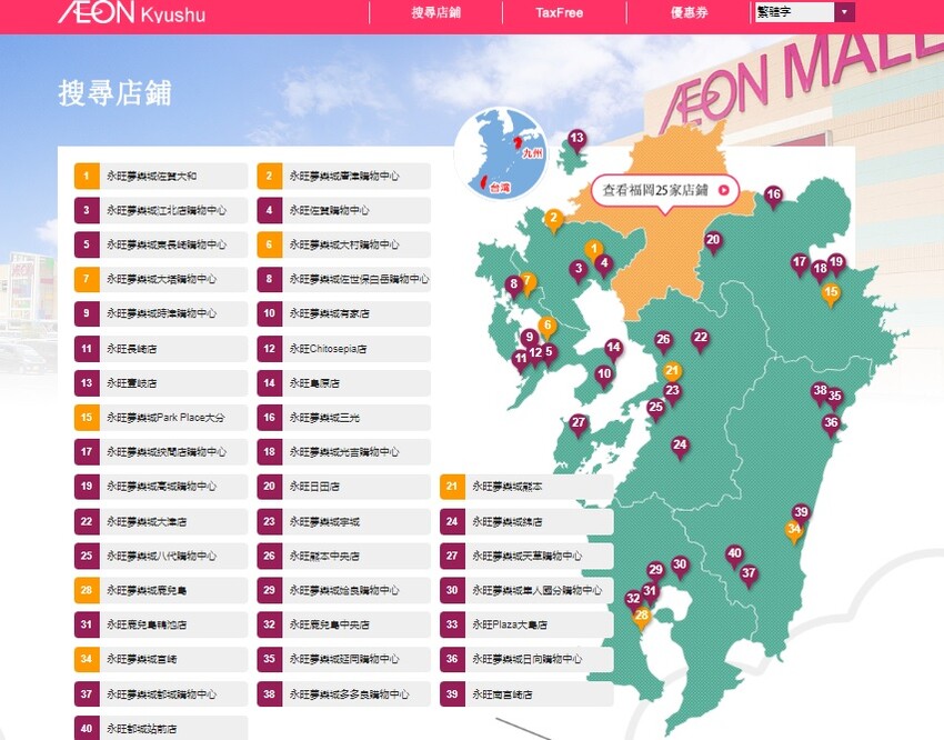 在九州永旺AEON就有66間分店,來九州旅行的觀光客大部分都會在福岡機場進出國,「AEON永旺夢樂城 福岡店」可說是九州受旅客喜愛的大型購物中心。九州永旺AEON店舖查詢