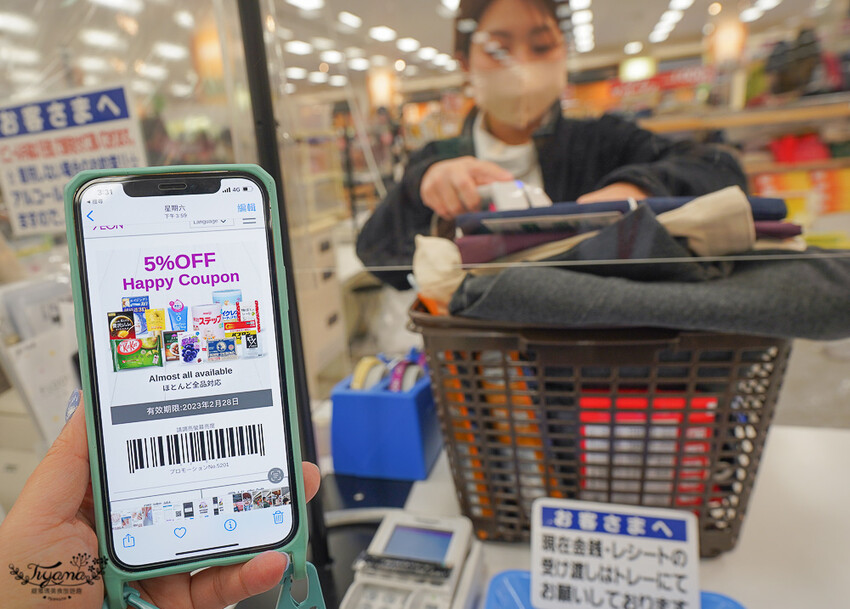 結帳時,務必先把手機的AEON95折專用優惠券備準好,出示給收銀台刷條碼才能享有優惠,想退稅需打完95折後,金額滿5500日元以上才能退稅(熟食生鮮類不能退稅)。