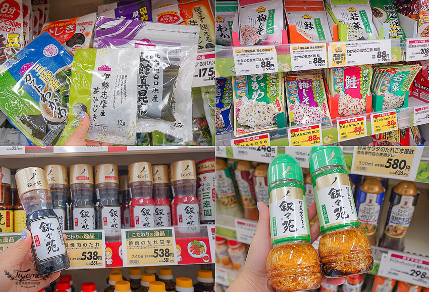 媽媽最愛買的醬料與配料區,常缺貨的敘敘苑燒肉醬、敘敘苑沙拉醬,這次終於一次買齊!!每次必買大包又便宜TOPVALU海帶芽,以及小朋友喜歡的各種口味香鬆、兒童牙刷牙膏,都一定要掃貨一輪才行。
