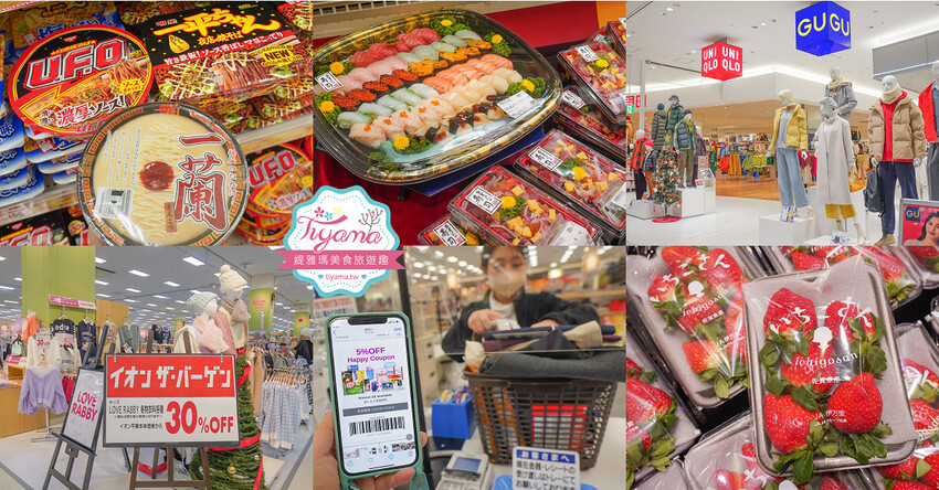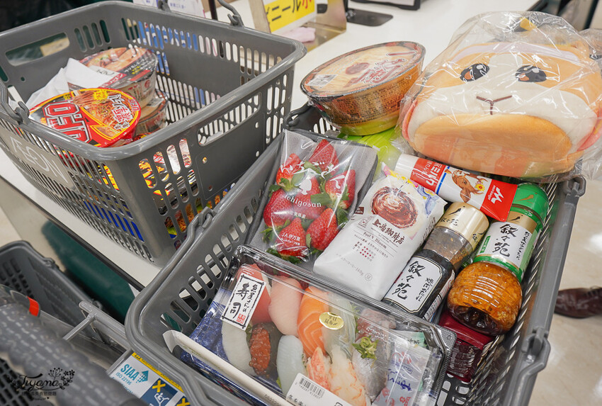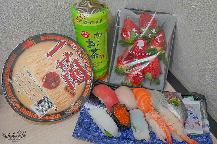「AEON永旺夢樂城 福岡店」太好買,直接買了壽司、草莓、泡麵帶回飯店當晚餐與宵夜,邊吃邊整理此趟的戰利品,買了TOPVALU發熱衣、睡衣、泡麵、雜貨,還有滿滿的伴手禮。