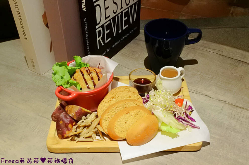 配菜有炒菇類、地瓜、生菜沙拉,以及烤麵包.