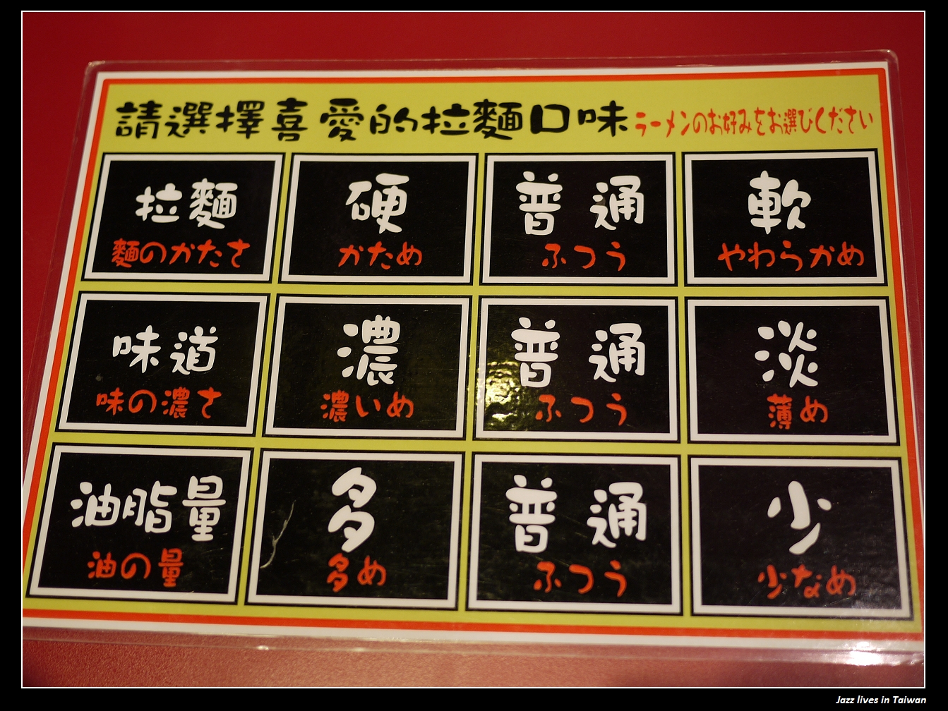 這是店家提供的選擇拉麵方式, 店家會依照客人的口味作量身調整, 麵的口感, 味道與油脂, 都可以選擇,