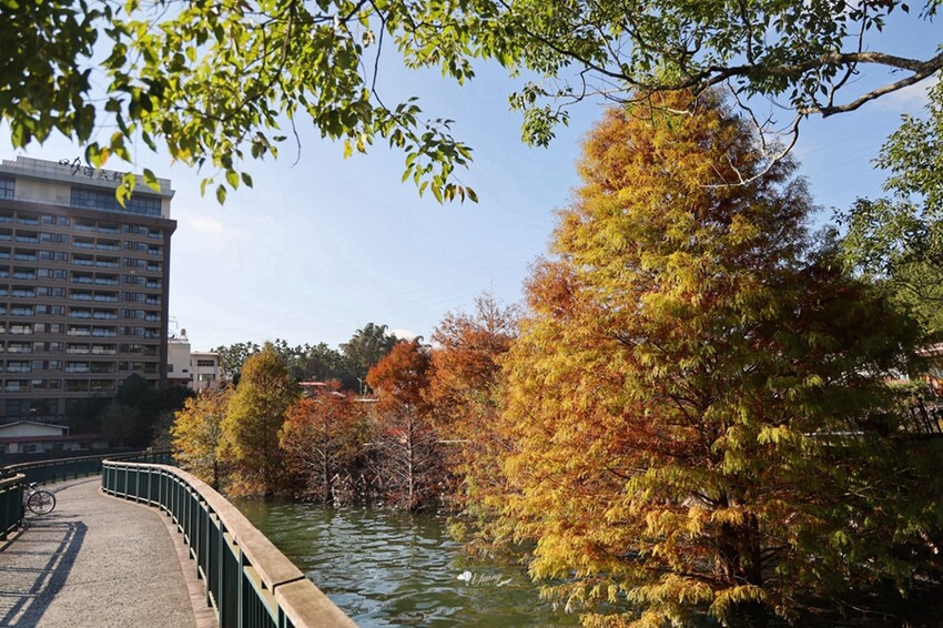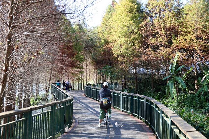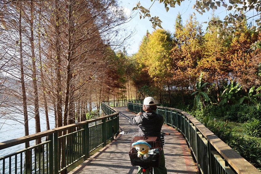 在湖中生長的落羽松,陪伴我們騎乘,微風徐徐吹在臉上,溫暖的冬陽灑在身上,真是適合騎乘自行車的季節。