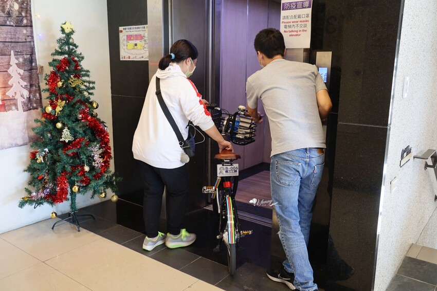 由於OPENBIKE自行車出租站位於水社綜合商場的3樓,服務人員會引導我們搭乘電梯下樓。