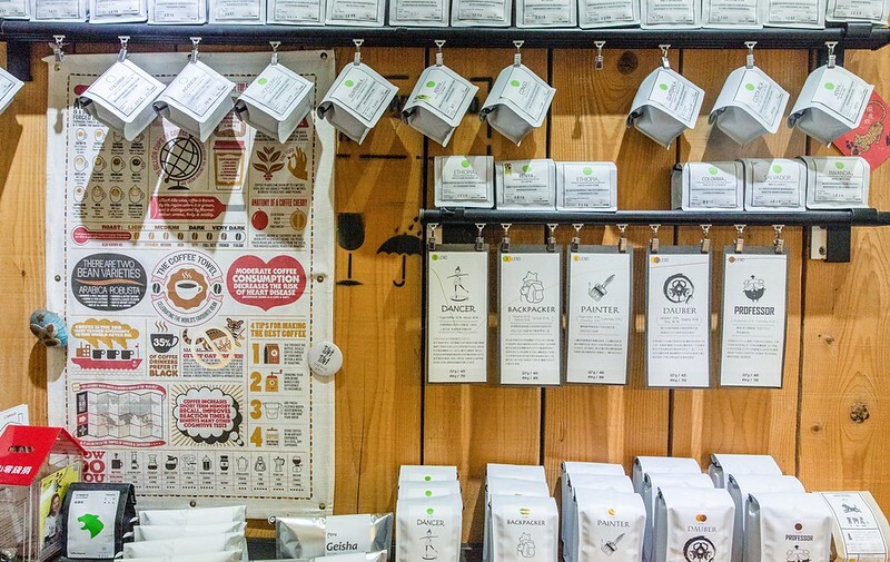 兩邊牆上盡是各種咖啡器具、各種口味的咖啡豆,不知道為什麼我有一種以前唱片行的感覺,以或興趣是店裡黑白主色的錯覺。