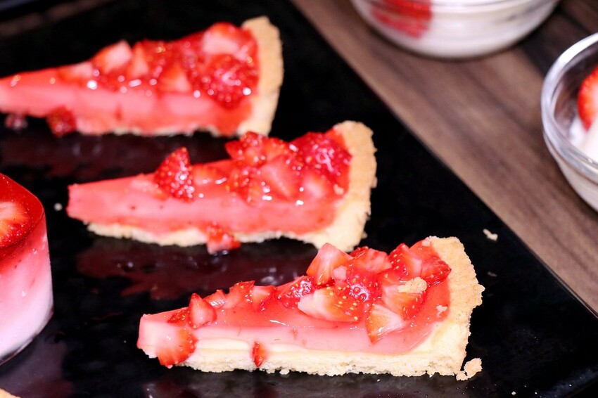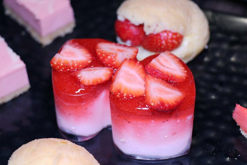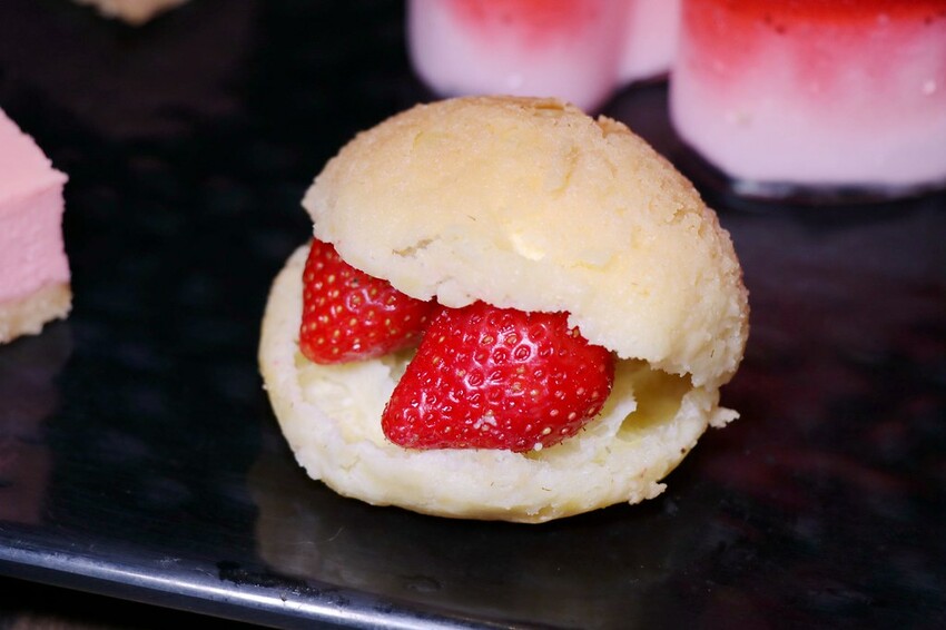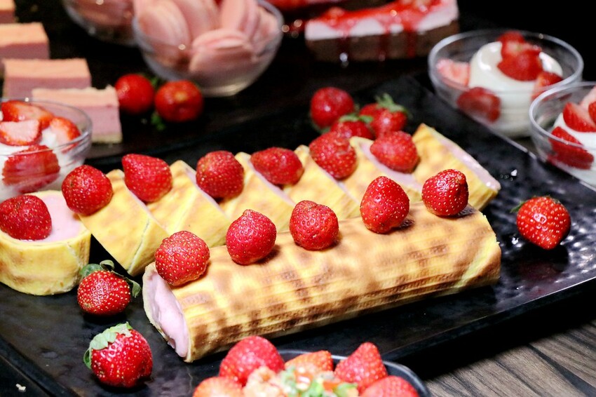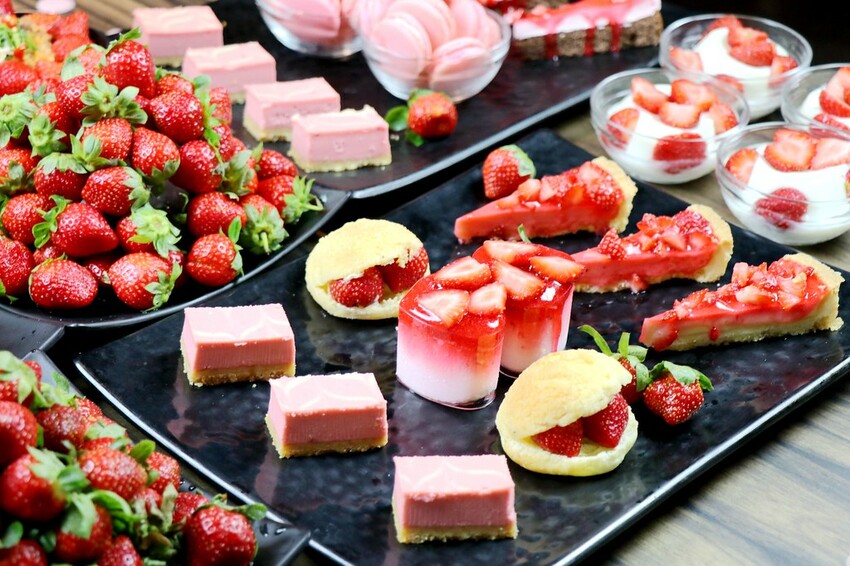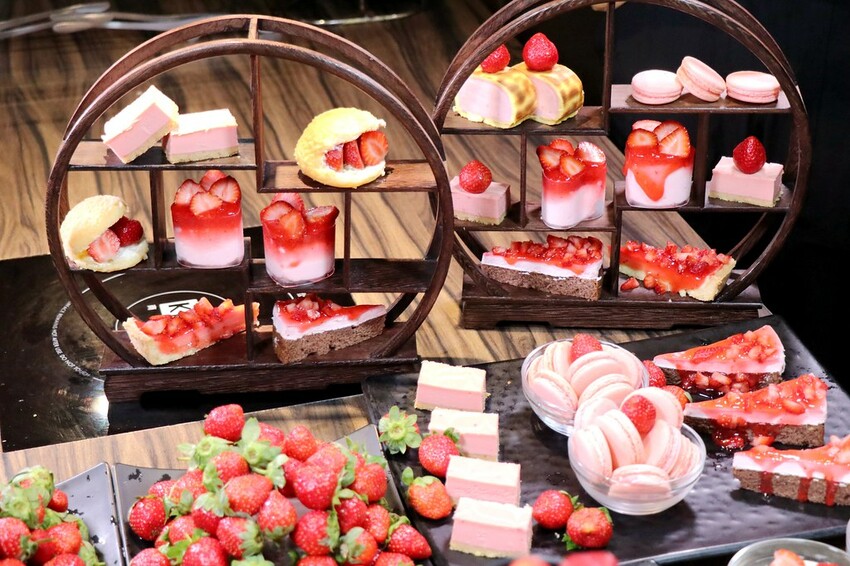 針對草莓季推出的甜點包括草莓泡芙,草莓起司磚.草莓慕斯蛋糕.草莓派