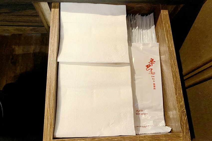 座位旁抽屜打開都會有乾紙巾.濕紙巾以及牙線等
