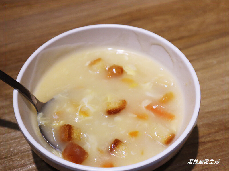 玉米濃湯我還蠻喜歡的,濃度與調味都不錯,加了酥脆麵包丁增添口感。