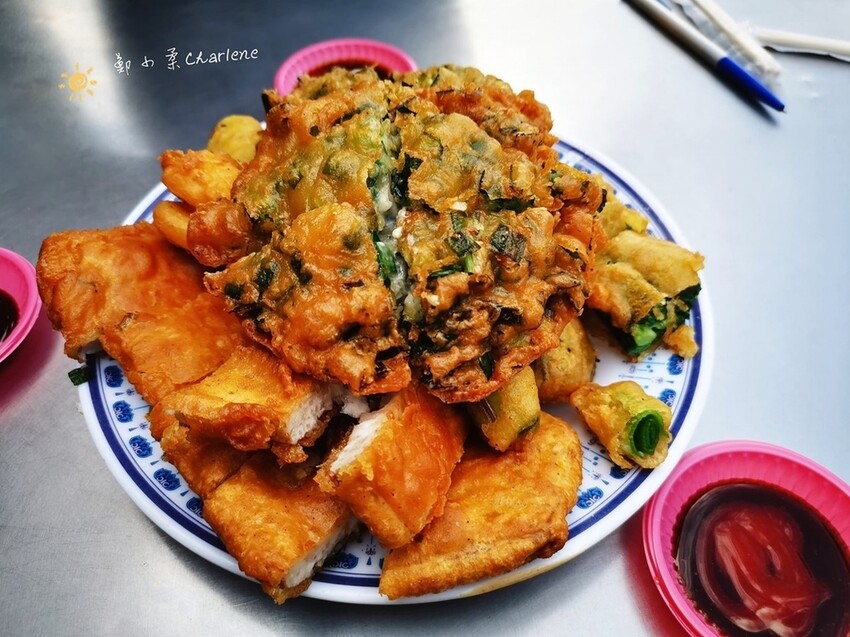 隨便點一下就滿滿一盤,有蚵嗲、韭菜條、炸粿、芋頭、蒜仔條,