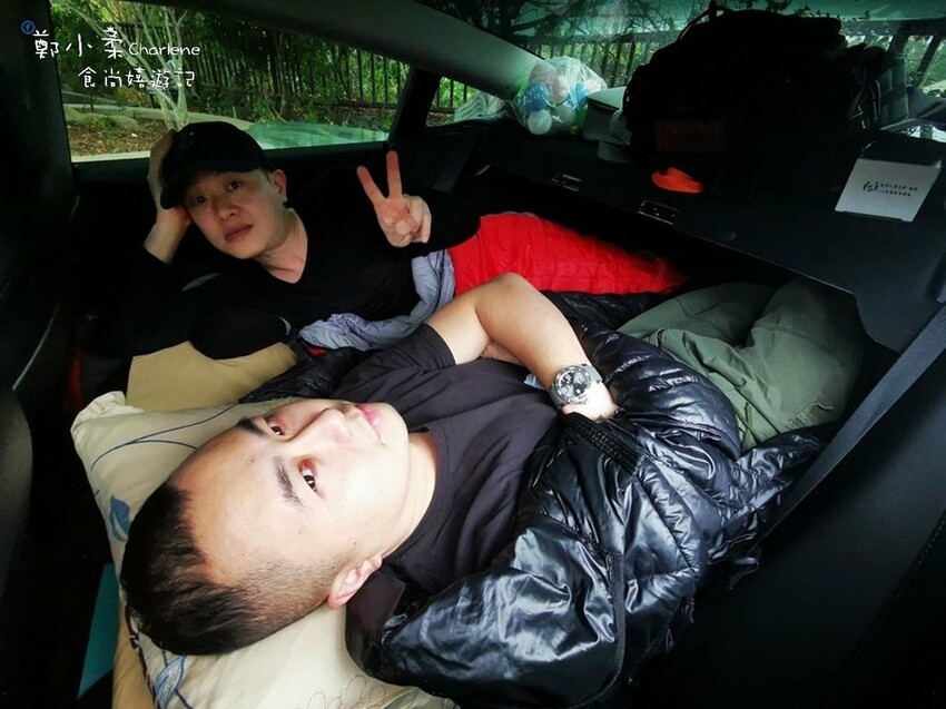 像是特斯拉有後車箱板,只要一膝蓋彎曲,就會撞到,另外他們都用睡袋,睡到最後,