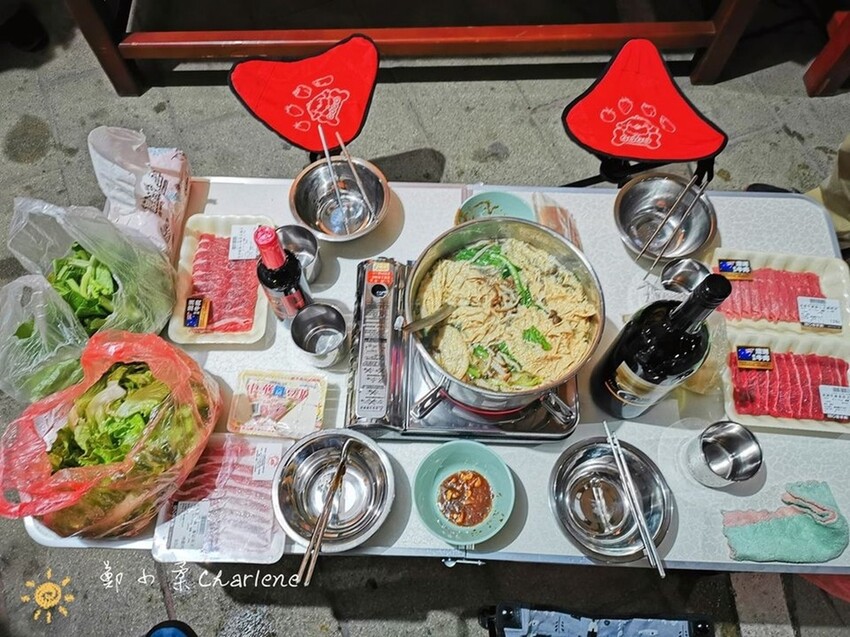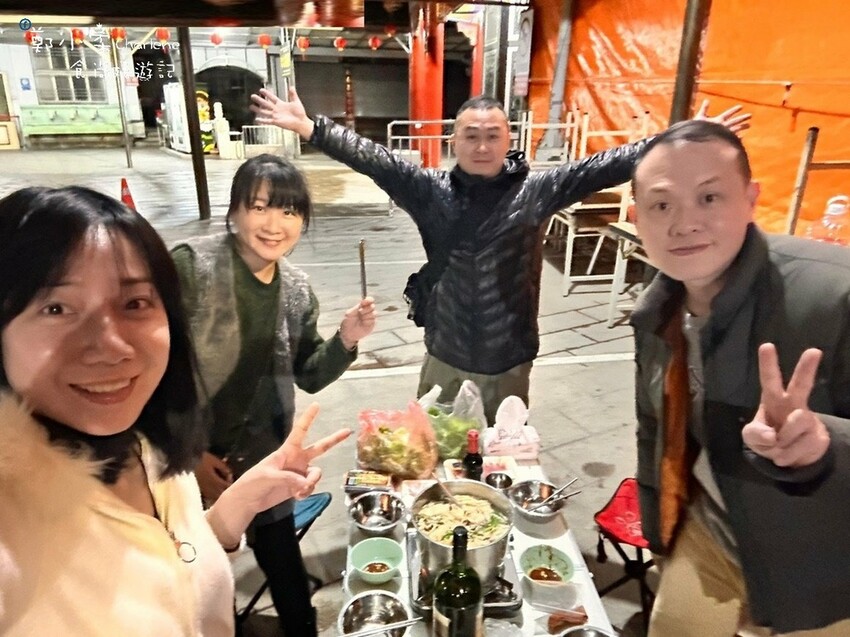 我們便開始在戶外煮起了火鍋,宮廟的人員也前來聊天,