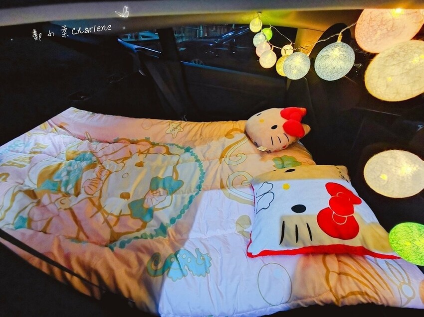 鋪上單人加大折疊床墊,佈置好的樣子好夢幻喔!!特斯拉後座可攤平,