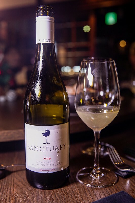 第一隻餐前白酒是紐西蘭聖麗白蘇維翁白酒「Sanctuary」的「Sauvignon Blanc 2019」,酒體微黃,濃郁水果酸甜前味很是清爽。