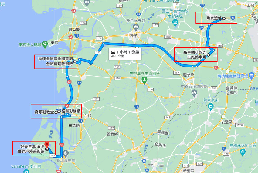 魚寮遺址落羽松->品皇咖啡觀光工廠->季津全蚵宴->高跟鞋教堂->貓咪彩繪牆->好美里3D彩繪村立體彩繪