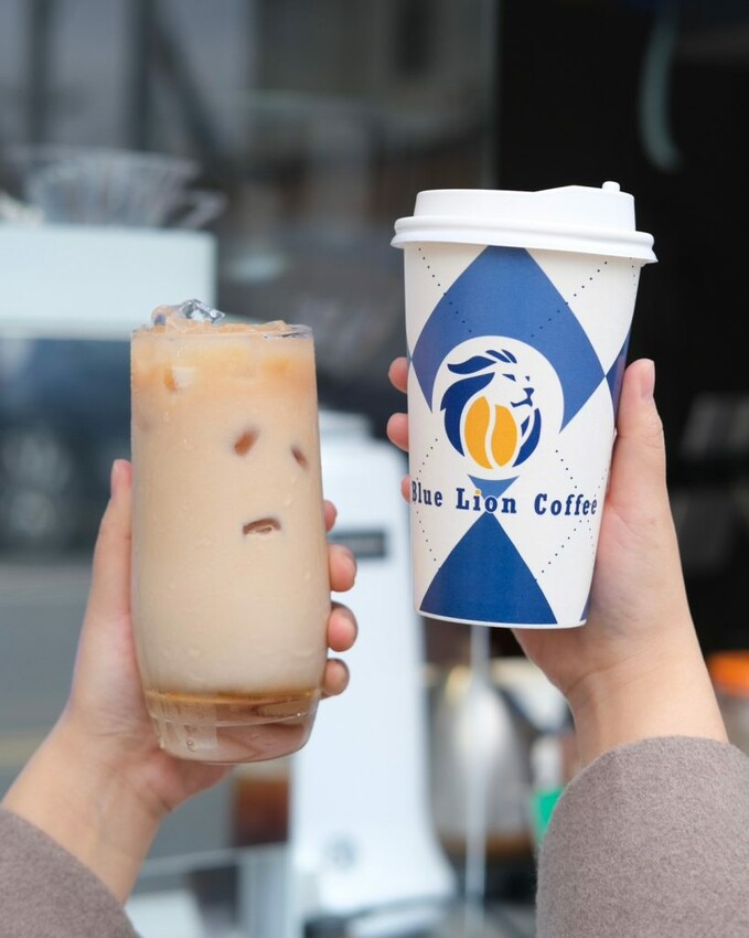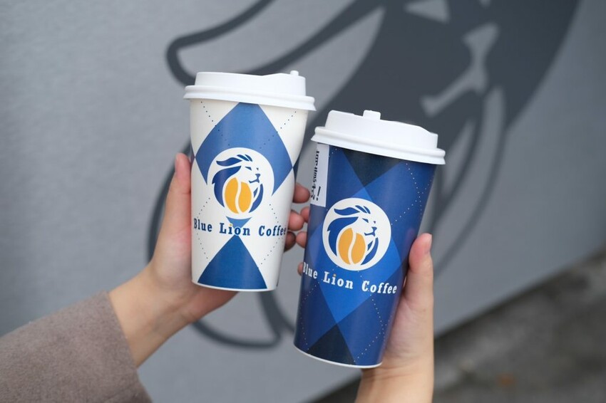 ▼【藍獅咖啡 Blue Lion Coffee】以紙杯以品牌藍白色設計,依照容量不同圖案也有差,材質拿起來也充滿質感。