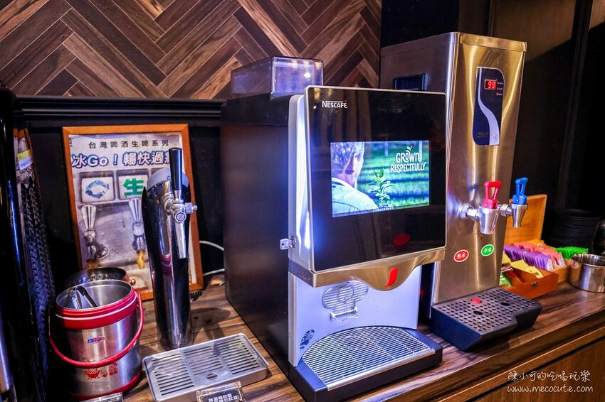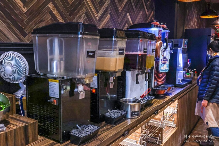 自助吧提供多種飲料、瓶裝可樂、HERSEY’S巧克力冰沙、哈根達斯和霜淇淋冰淇淋吃到飽,還有和牛滷肉飯、台啤生啤酒無限暢飲,想喝熱茶也有高檔的唐寧茶茶包。